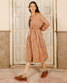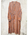 A relaxed shirt dress with displaced hand block printed stripes. Features a drawstring waist and hand embroidered buttons. Length 46". The model is wearing a size S. Made in 100% organic soy fiber cotton.