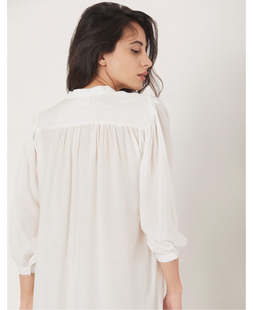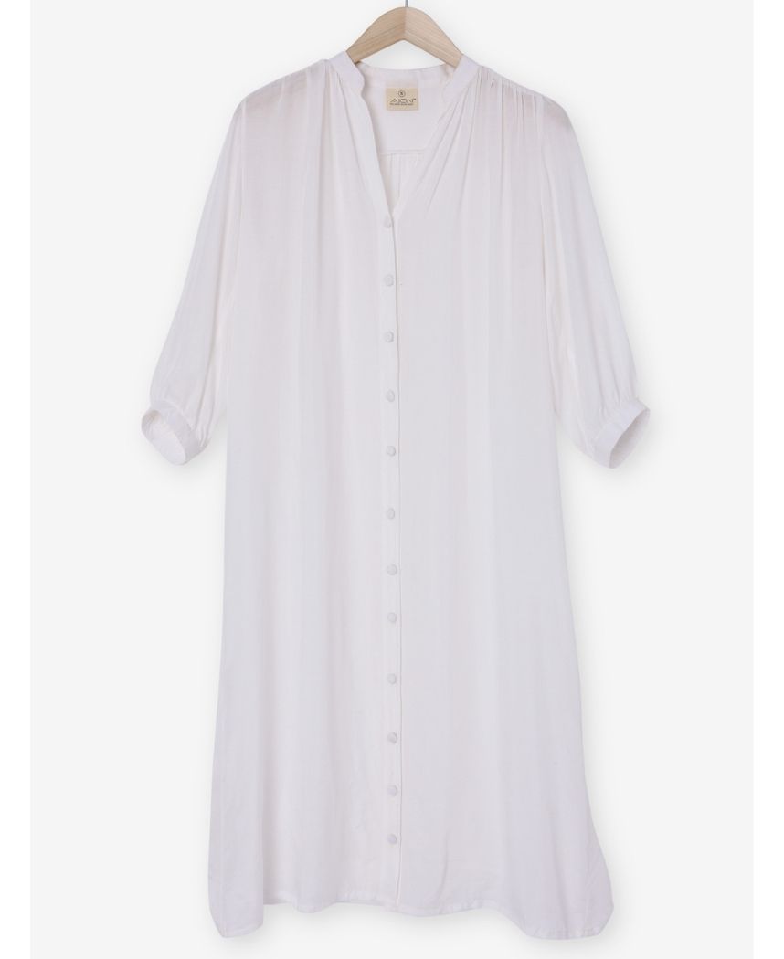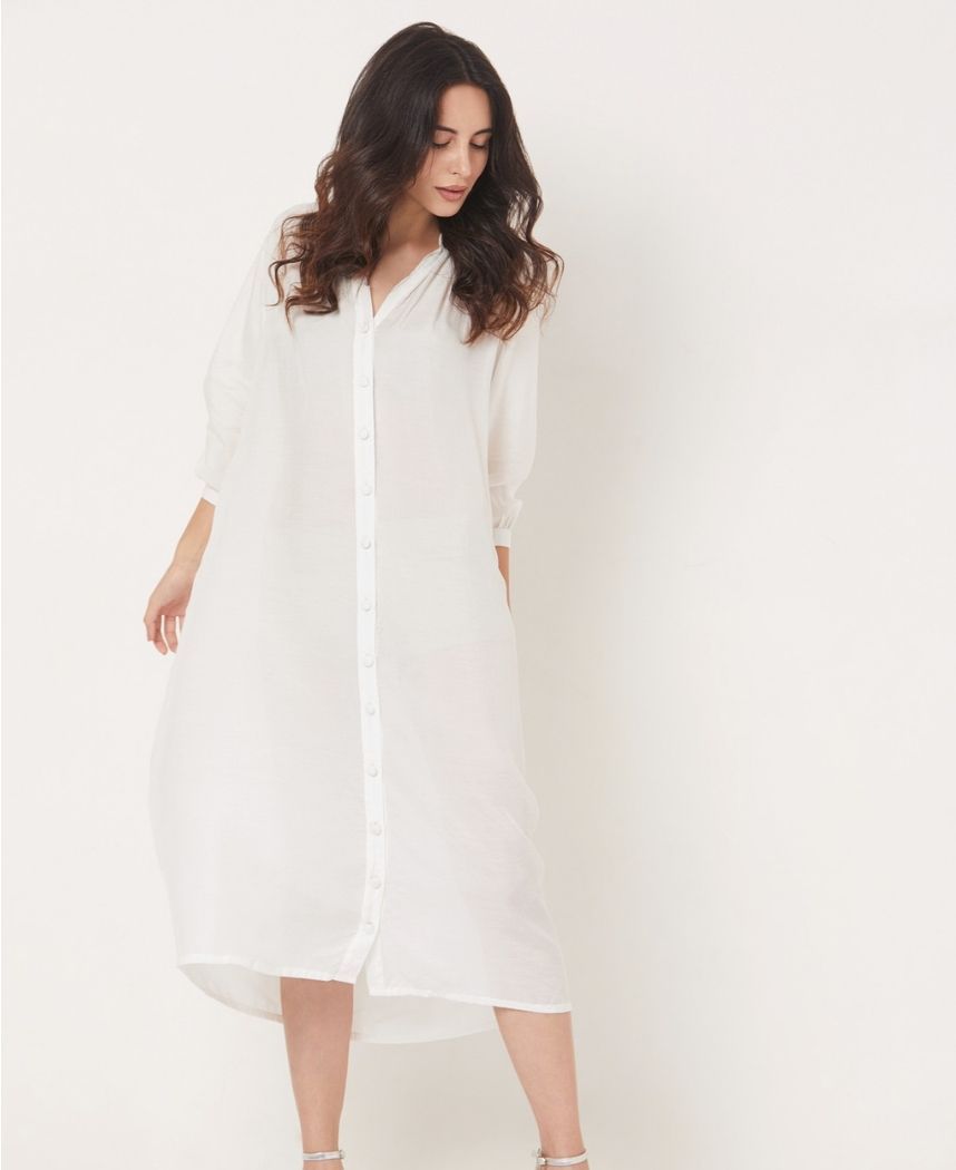 An oversized shirt dress with a front button placket gathered shoulders and a gathered back yoke. Length 46".