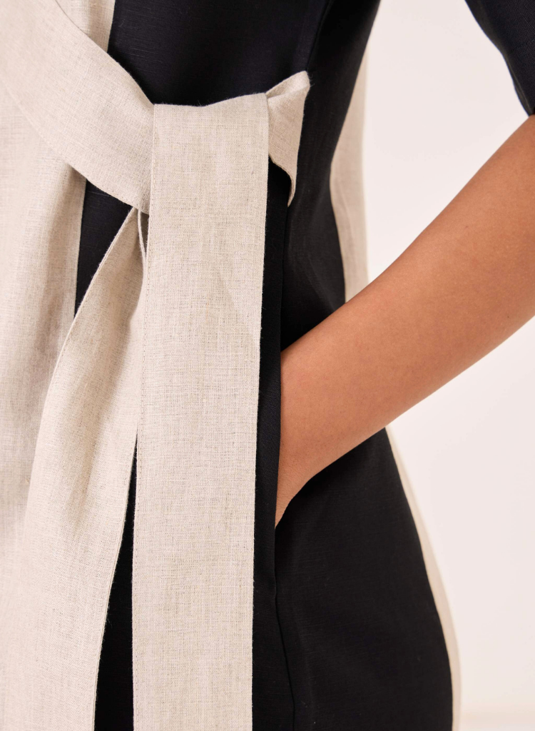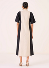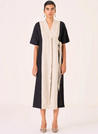 A button down midi dress with a V neck shawl collar along with a side tie detail and a concealed placket. Features a colour block side panel for a flattering illusion, drop shoulders and inseam pockets. The model is 5'7 and wearing a size XS.