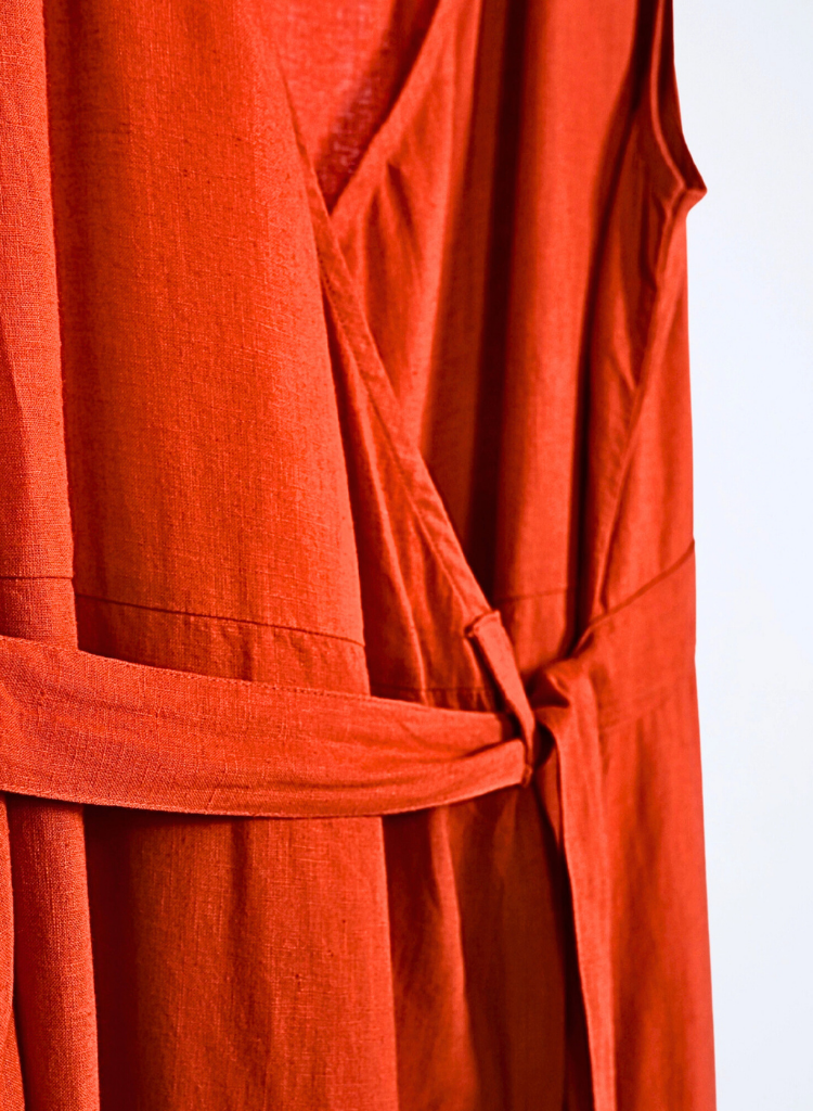A relaxed fitting maxi dress with a wrap detail feauring a V-neck. The model is 5'6" and is wearing size XL.
