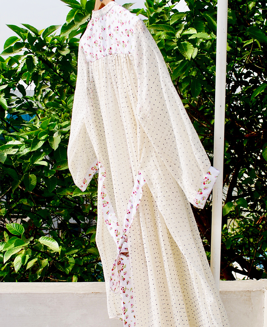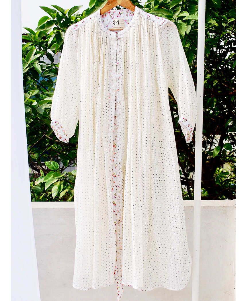 Origami Overshirt Dress is hand block printed in cotton Kota Doria. Features a loose, flare and an anti-fit silhouette, a closed round neck, peasant sleeves, gathers at the shoulder and neck and loop and front buttons for closure. It comes with a contrast floral attached waist belt and a basic off white 100% cotton slip. Length - 44 inches. Sleeve Length - 16 inches. This garment is carefully crafted from hand block printed fabric. The irregularity is its true nature, which defines the unattainable beauty that lies in its imperfections.