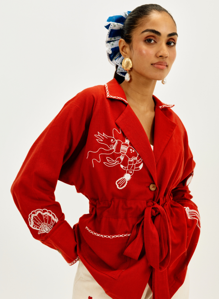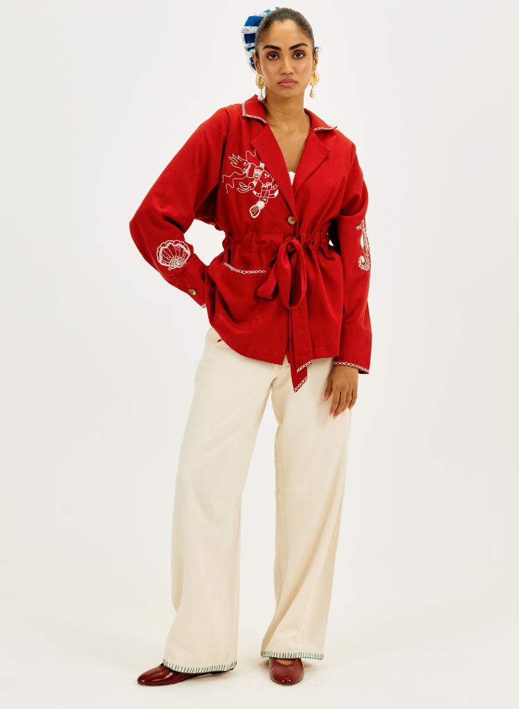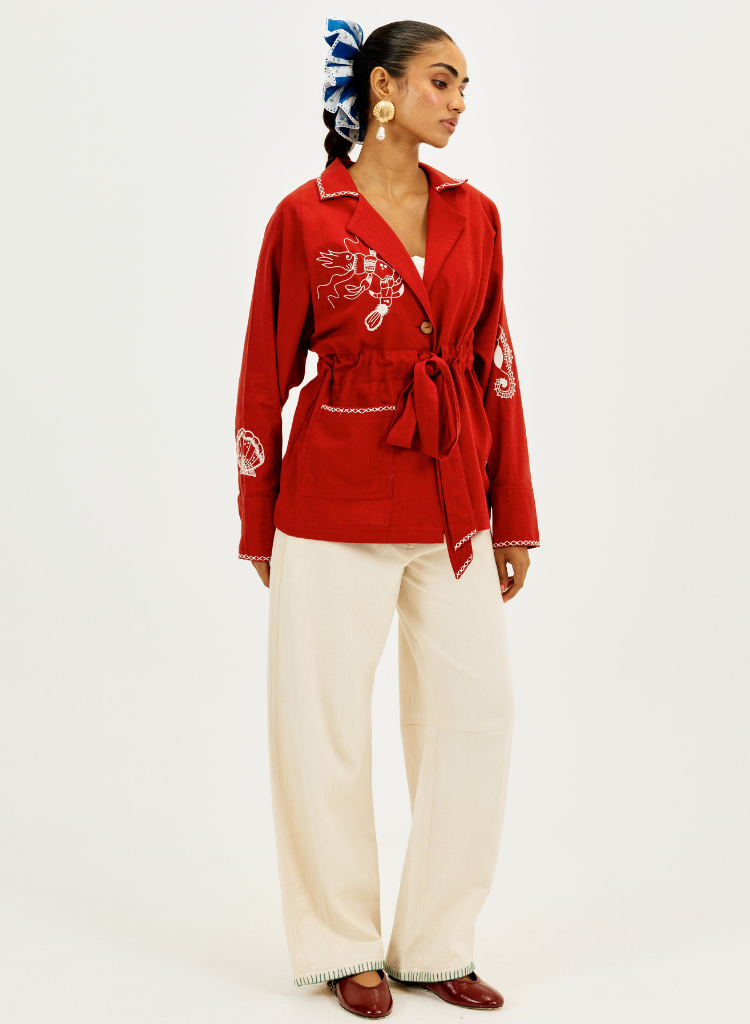 The Handloom Shacket is adorned with marine-inspired hand embroidery in contrasting ivory with wooden buttons, roomy patch pockets, and a self-tie belt create an effortless blend of utility and statement style. The white cross-stitch detailing along the collar and cuffs adds a signature touch. Length 27". The model is 5'6" and is wearing a size XS.