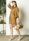 A two-piece set pairing the Overlay Shirt and the Straight Leg Shorts. The button-down shirt with overlay details on the front bodice that ties up at the back features a classic collar and drop shoulder with wide 3/4th sleeves with cuffs. Length 27"- 29". The straight-fitting mid-rise shorts with folded hem feature side pockets and single-welt back pockets. Length 17"- 19.5". The model is 5'7" and is wearing a size S.