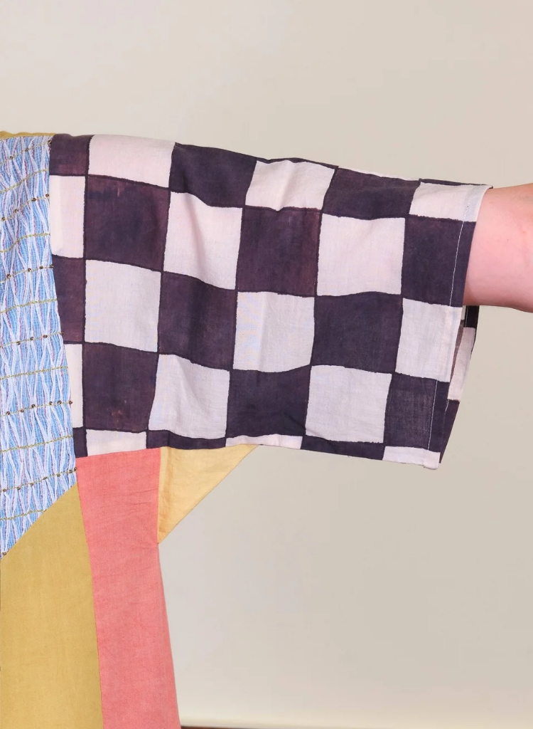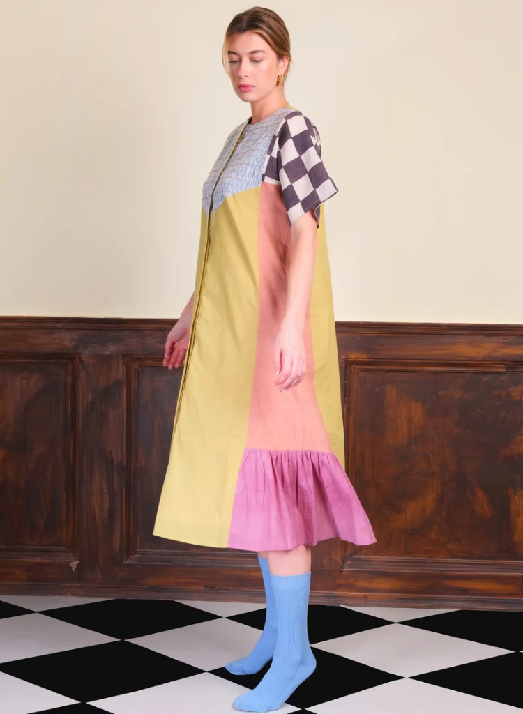A high‑neck shirt dress with concealed placket, pintucks, gusset and short sleeves. It features panels dyed with Indigo, Pomegranate, Madder, Lac and hand-painted sections in Kassim. The pintuck panel is made with Indigo and Kota Doria fabric and hand-embellished with brass sequence. Length 48". The model is 5'10", and is wearing size S-M.