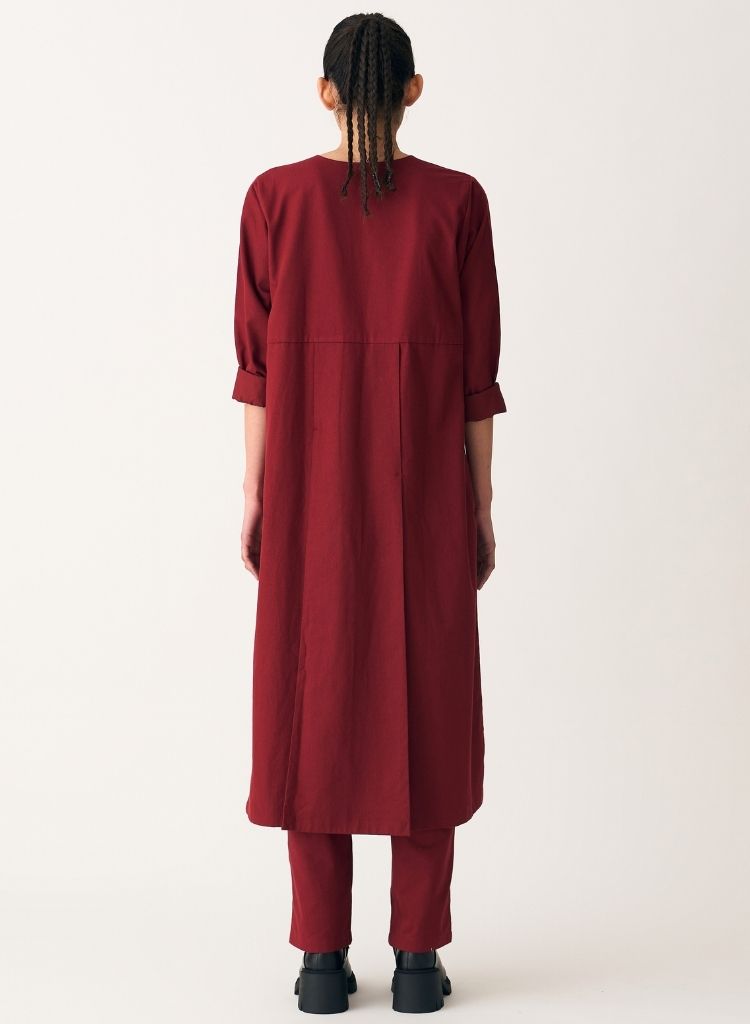 A two-piece set pairing the Panel Jacket and the Front Pleat Pants. The long jacket with front button-down opening and patch pocket details features a round neck and long cuffed sleeves. Length 48". Made in cotton twill and cotton poplin. The solid straight pants with pleat details feature a front button closure and inseam pockets. Length 41". Made in heavy cotton Twill.