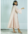 A relaxed panelled dress with flared sleeves and Chikankari embroidery on organza pockets. Features a classic collar and front button placket. Length 48".