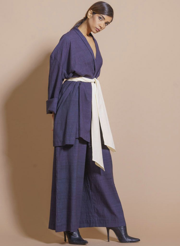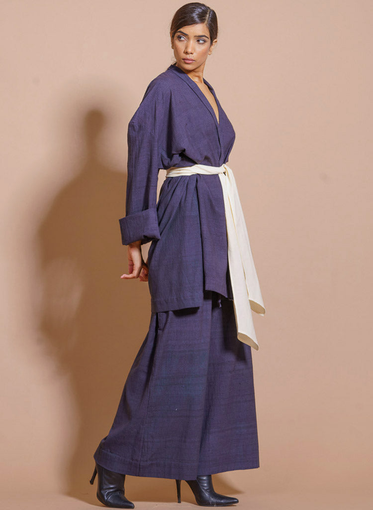 A two-piece set pairing the Paprika Jacket and the Paprika Pants. The front open relaxed fitting jacket features a tie-up. The solid flared pants feature an elasticated waist and inseam pockets. Made in handwoven cotton.