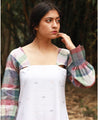 A light and flowy cotton dress with jamdani motifs and an asymmetric hem. Features a square neck and checkered gathered sleeves. Length 50".