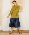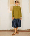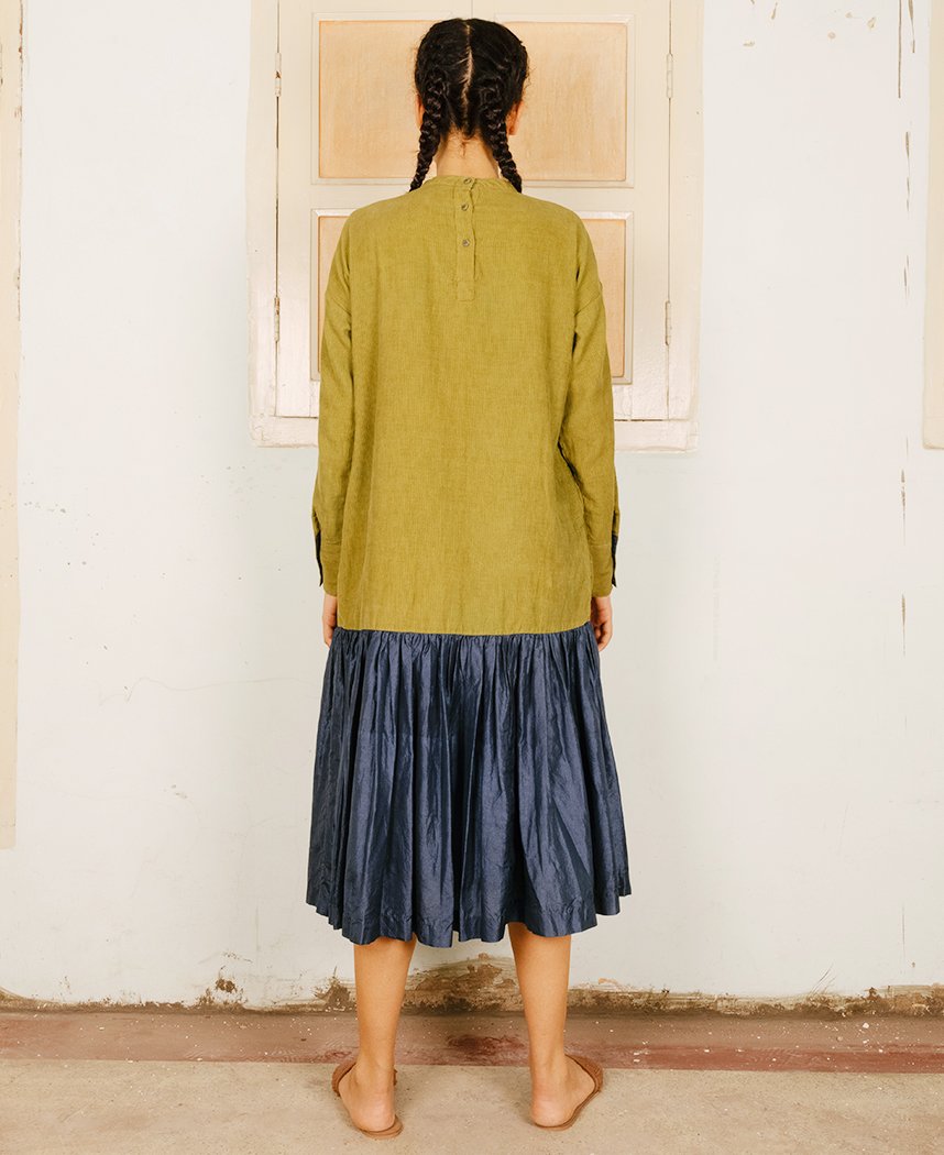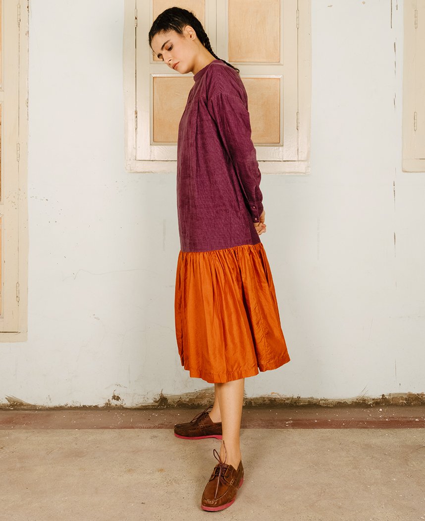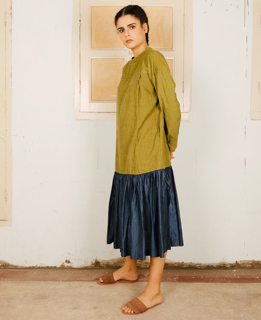 A boxy colour-blocked dress with a raised collar and contrast stitch details at the yoke. Features inseam pockets, gathered drop waist, and hand-embroidered buttons at the back and cuffs. Length 45". The model is wearing a size S. Made in 100% cotton corduroy with a 100% mulberry silk tier.