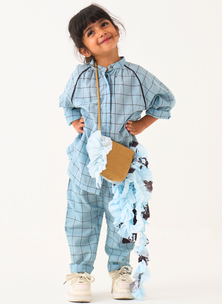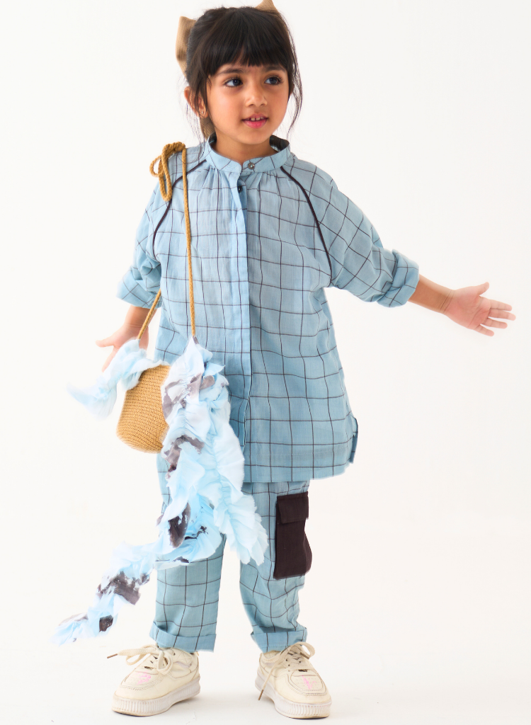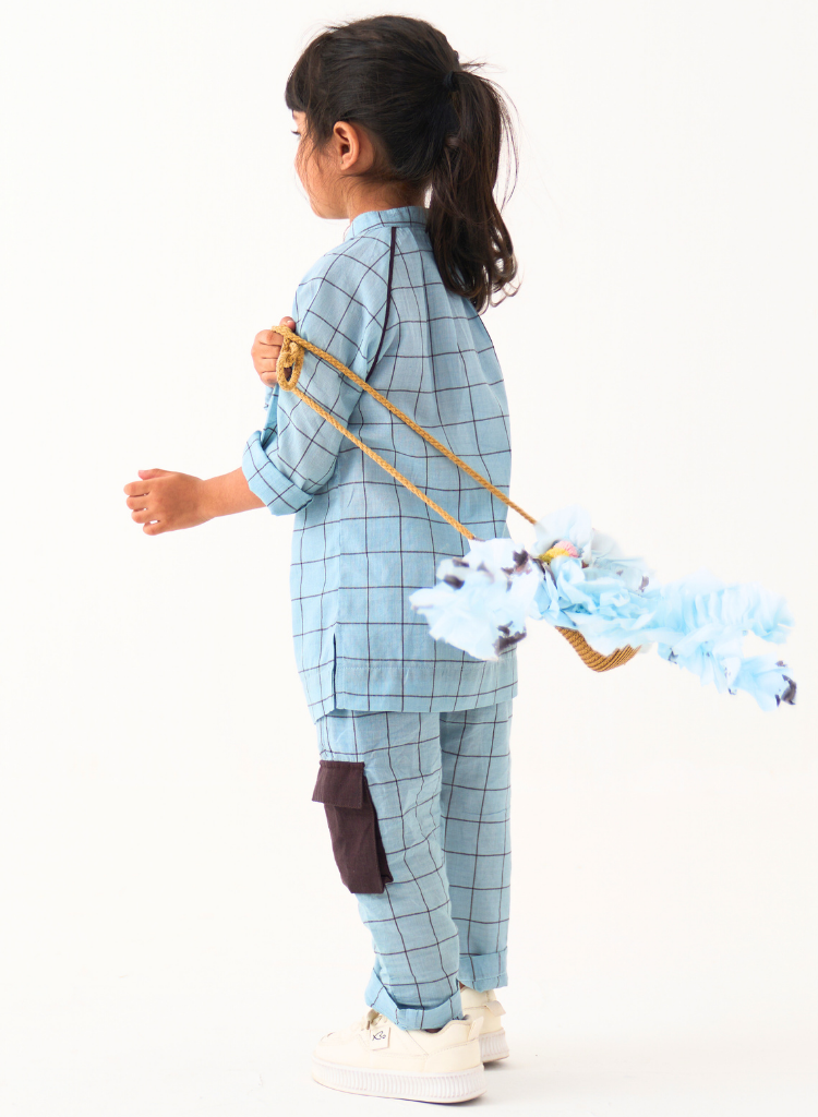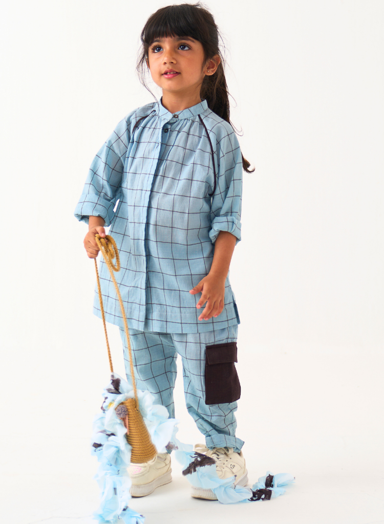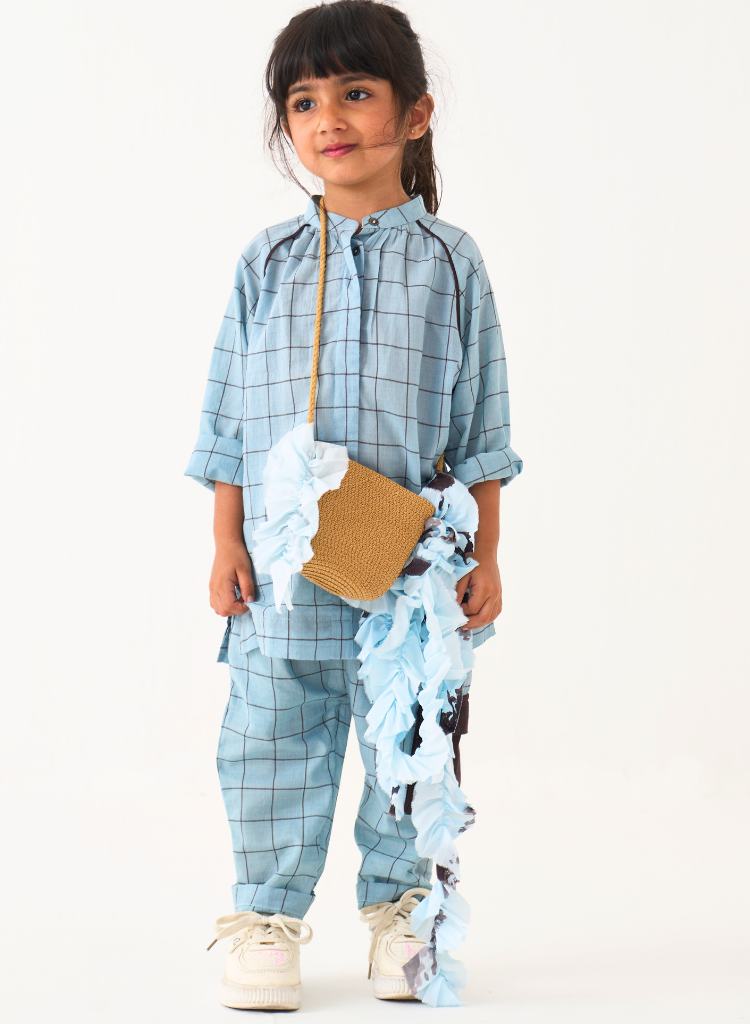 A two-piece set pairing the Peasant Top and matching pants. The relaxed fitting top features a mandarin collar with a front button placket and side slits. The matching pants feature an elasticated waist and inseam pockets.