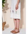An A-line midi dress with a slightly overlapping V-neck and loose fitting 3/4 sleeves featuring hand embroidery on hem and neckline and side-seam pockets. Length 42". The model is 5'8" and is wearing size XS.