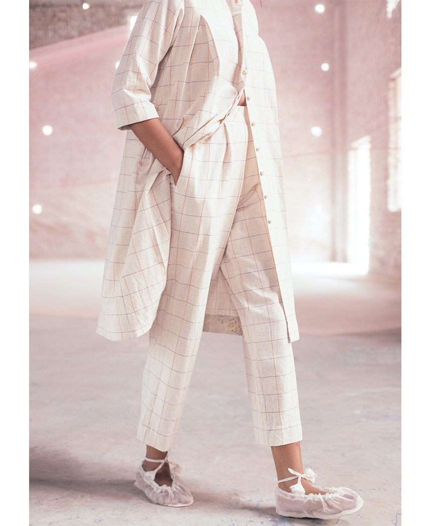 Straight fit pants with hand screen printed pastel checks and pleated waist detail. Features an elasticated back and inseam pockets. Length 37". The model is 5'8" and is wearing size S. Made in 100% cotton.