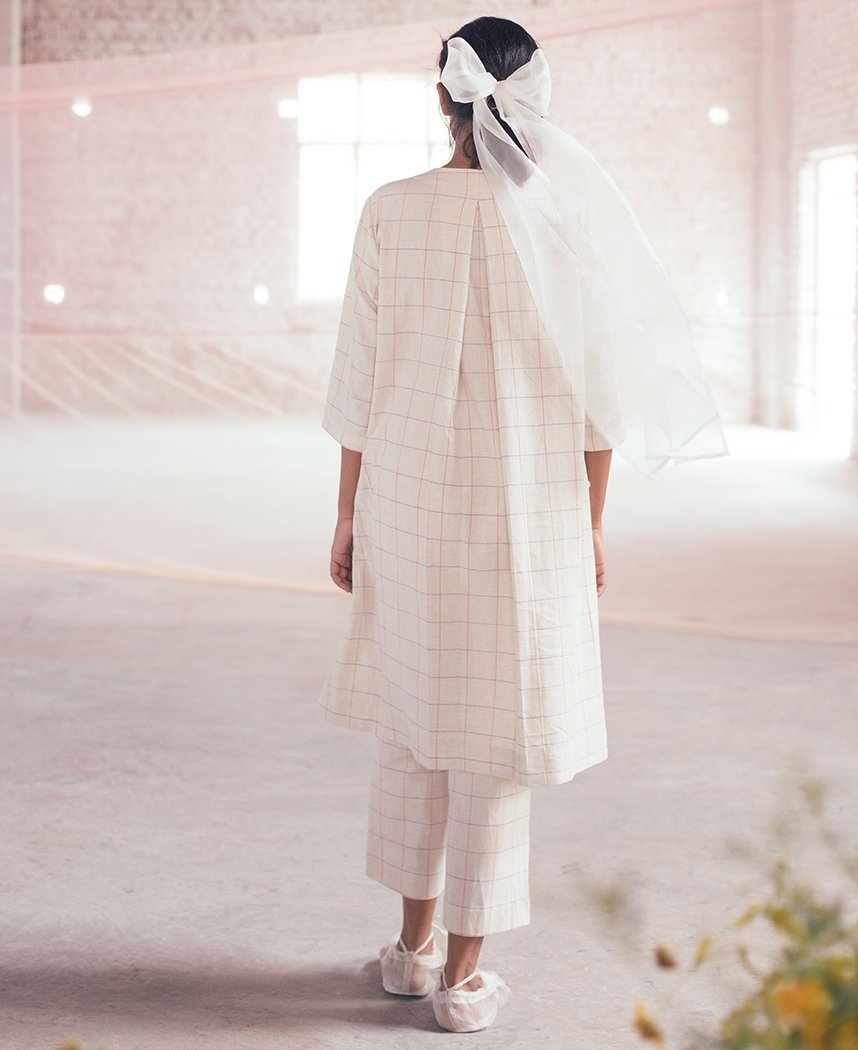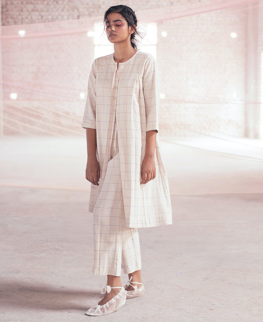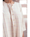 An A-line shirt style tunic with pastel hand screen printed checks and embroidered buttons. Features inverted pleat details, a front button placket and inseam pockets. Length 40". The model is 5'8" and is wearing size S. Made in 100% cotton.