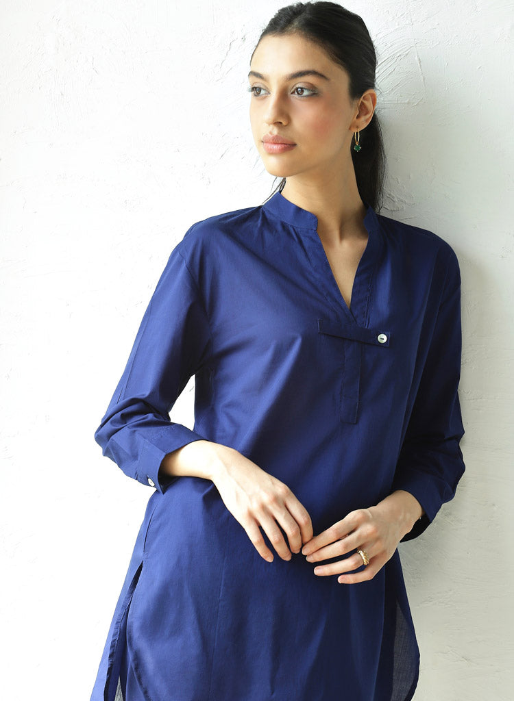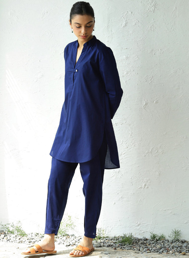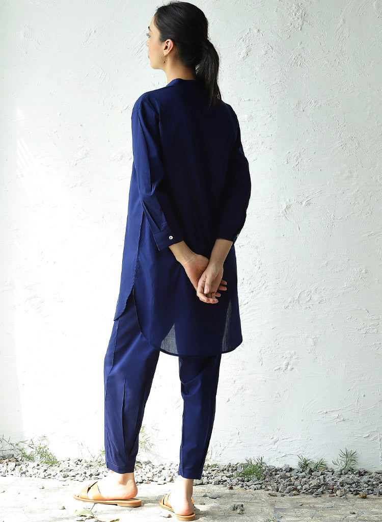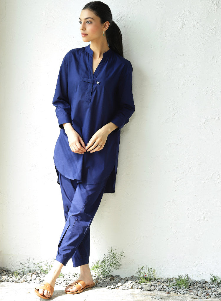A two-piece set pairing a short tunic and matching pants. The short tunic features a band collar with a v-cut, cross placket lapel, and shell buttons. Front length 31", Back length 33". The matching pleated pants feature an elasticated waistband. Length 35". The model is 5'9" and is wearing size S.