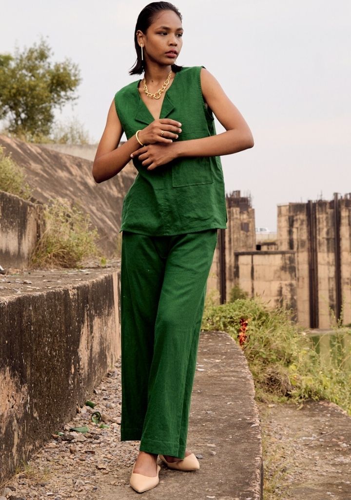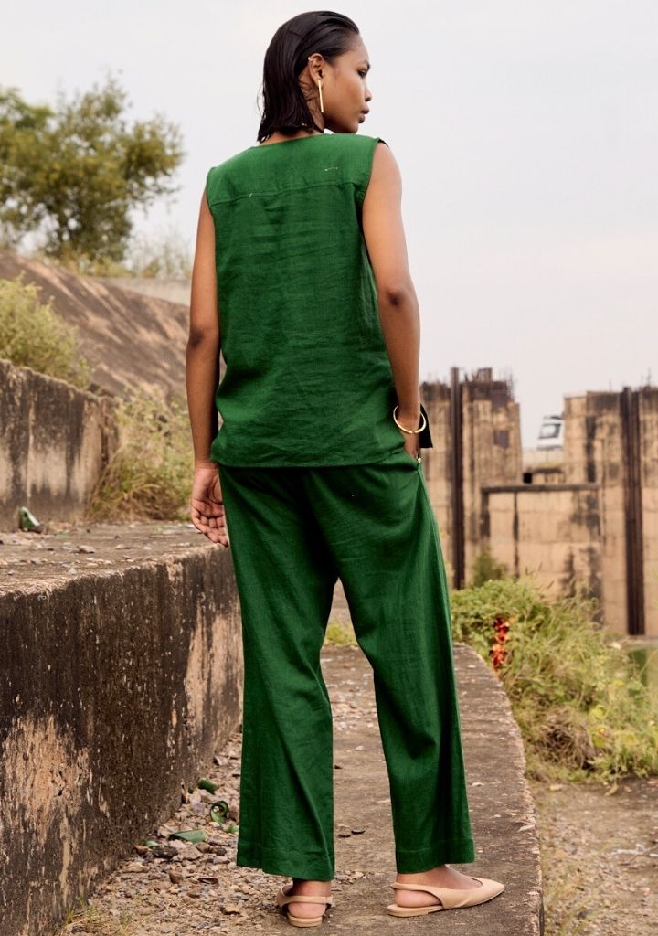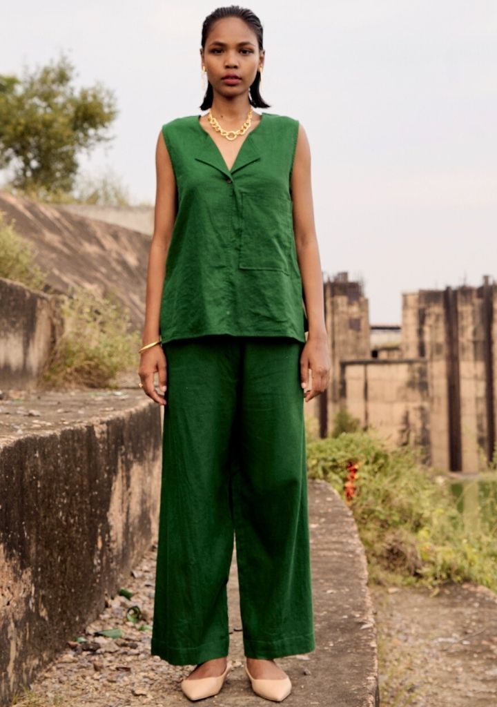 A two-piece set pairing a sleeveless tunic and matching pants. The sleeveless tunic features a round neck, a front button opening and side slits. Length 25.5". The matching pants feature a front button opening and inseam pockets. Length 34.5". The model is 5'7" and is wearing size S.
