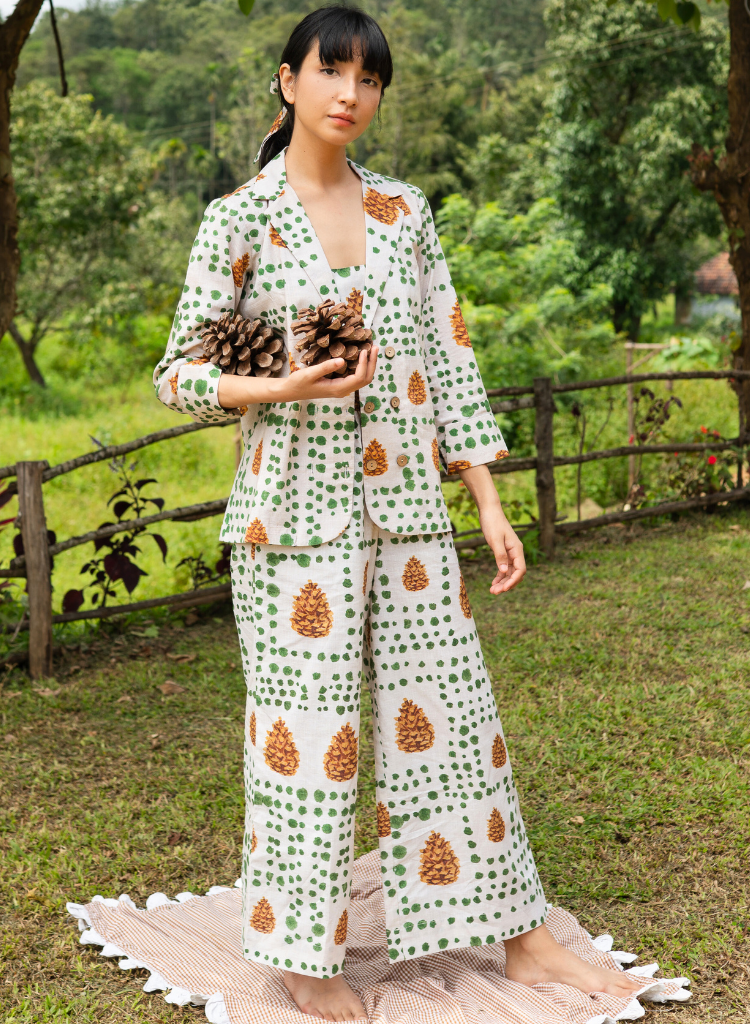 A two piece set pairing the Pinecone Jacket and the Pinecone Pants. The double breasted jacket features a lapel collar and long folder sleeves. Length 26". Comes with a bralette. The pants features an elasticated back and side pockets. Length 37". The model is 5'3" and is wearing a size S.