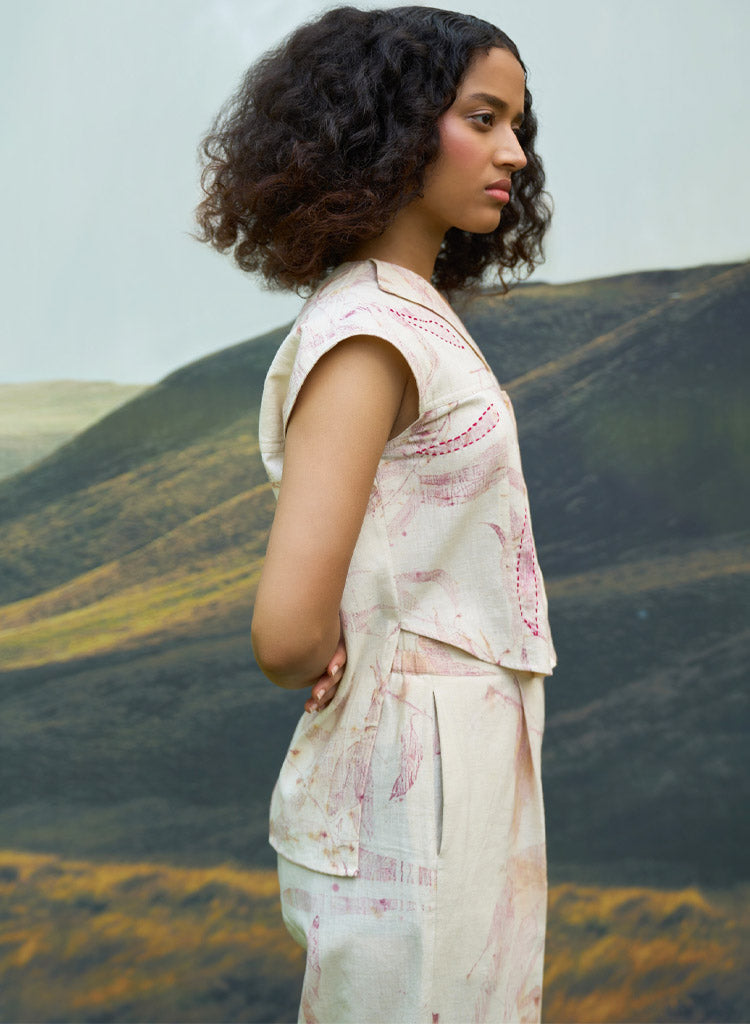 A two-piece set pairing the Pink Foliage Top and the Pink Foliage Flared Pants. The boxy fit cropped shirt with panelled details features a lapel collar and extended shoulders. Length 19". The flared pants with pleat details feature a fitted waist and inseam pockets. Length 40.5". The model is 5'6" and is wearing a size S.