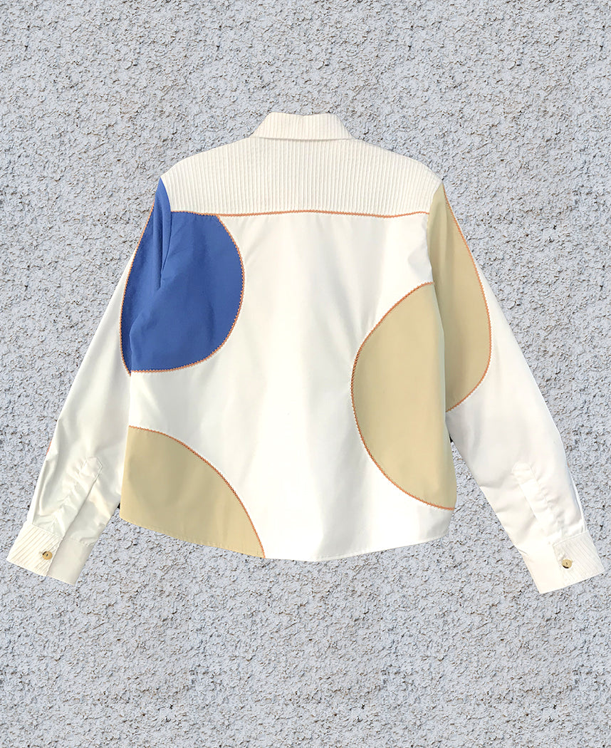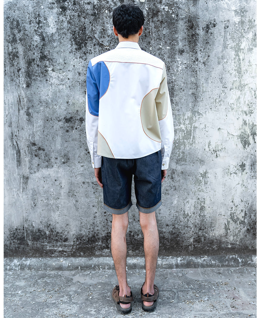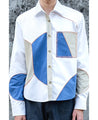 A classic shirt with colour blocked hand crochet attached seams featuring pintuck yoke details, full sleeves and a shirt collar. Length 29". The model is 6'1" and is wearing a size S.