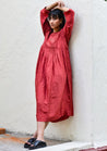 A relaxed fitting midi dress with pintucks featuring a round neck with a v-cut and inseam pockets. Length 47". The model is 56' and is wearing a size S.
