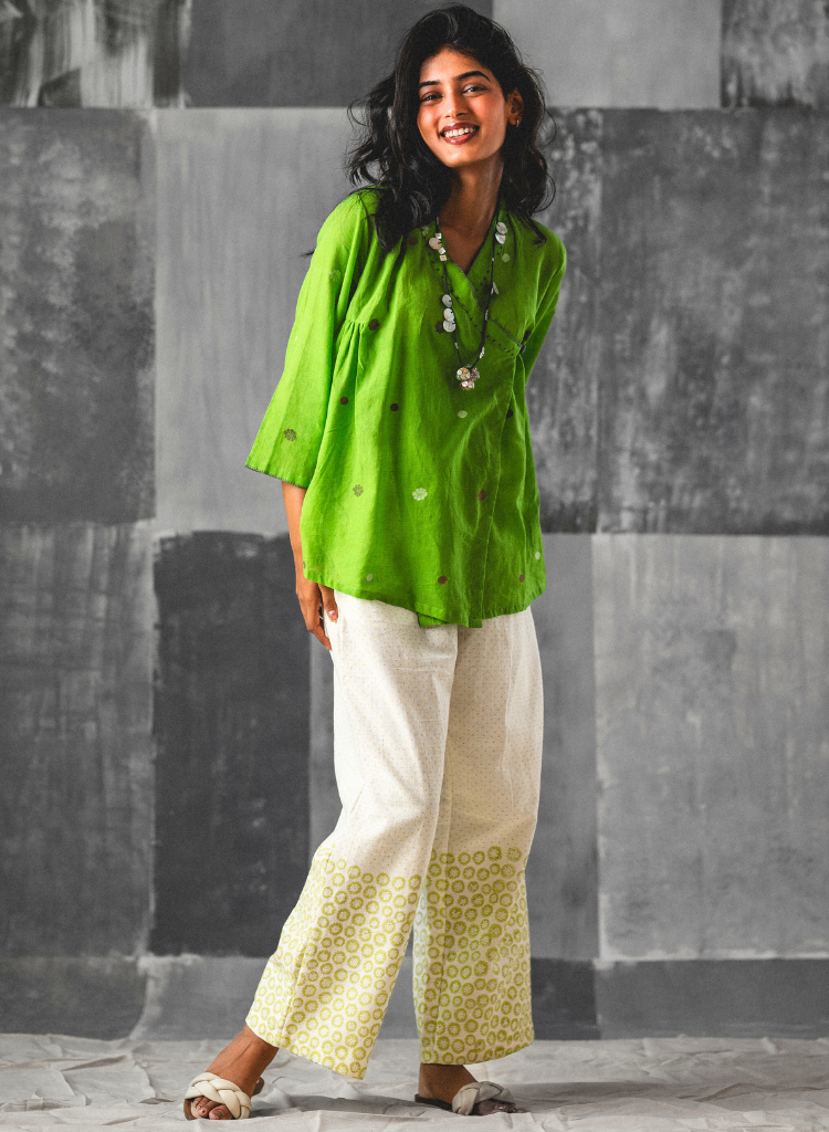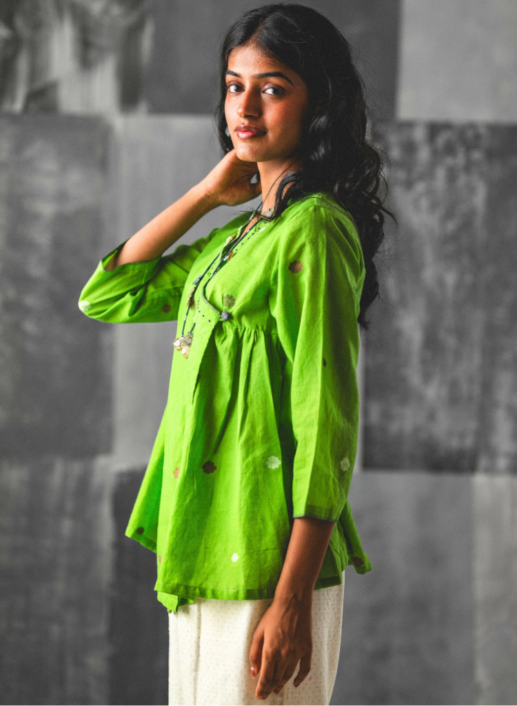 An Angrakha style top with floral Jamdhani print, overlapping asymmetrical front with single crochet button closure, embroidery details, and gathers. Features a V-neckline and 3/4th sleeves. Length 24.5". The model is 5'5" and is wearing size S.