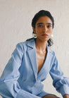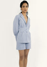 A single breasted jacket with a notched lapel and a side pleat detail featuring a front double button closure. Length 26.5". The model is 5'8" and is wearing size XS.