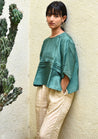 A boxy top with pleat details featuring a round neck and side slits. Length 22". The model is 56' and is wearing a size S.