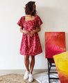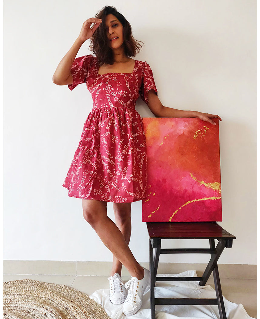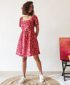 A fun fit and flare dress with a paisley floral print and a square neck. Features a gathered waist, short pleated sleeves, inseam pockets and a concealed back zipper. Length 35". The model is 5'6" and is wearing size M. Made in cotton, with mul lining.