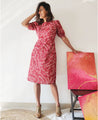A fitted sheath dress with a paisley floral print and puffed sleeves. Features a closed round neck, inseam pockets, and a concealed back zipper. Length 40". The model is 5'6" and is wearing size M. Made in cotton, with mul lining.