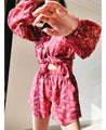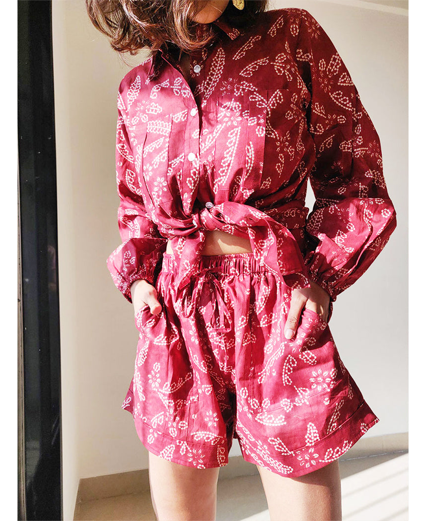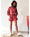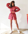 A two-piece set pairing the Plum Shirt and Short with a paisley floral print. The shirt features patch pockets on the chest, a classic collar and elasticated cuffs. Length 27". The shorts feature a foldover hem, an elasticated drawstring waist and inseam pockets. Length 13". The model is 5'6" and is wearing size M. Made in cotton.