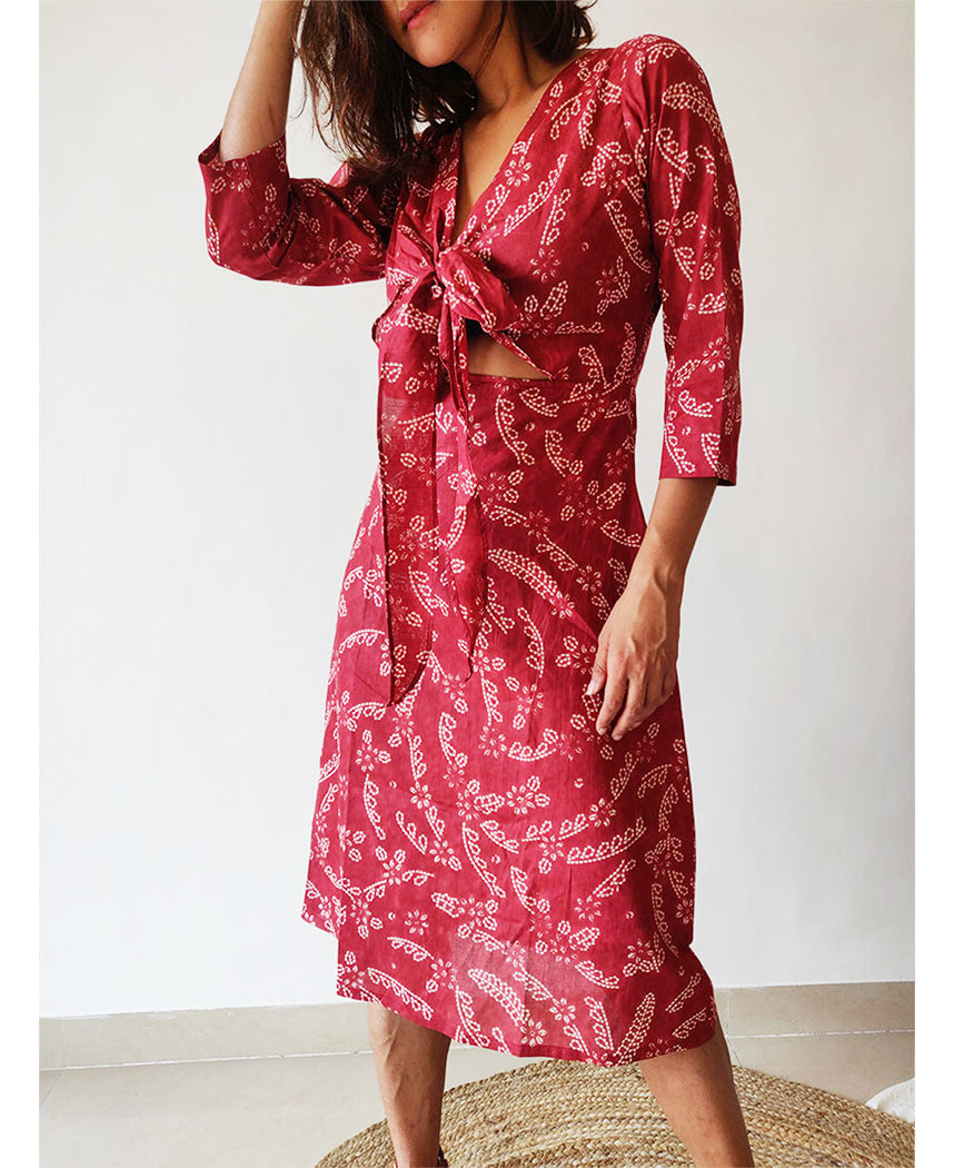 A playful dress with a paisley floral print and cut-out detail at the front. Features a tie-up bodice, inseam pockets, and a concealed back zipper. Length 42". The model is 5'6" and is wearing size M. Made in cotton, with mul lining.