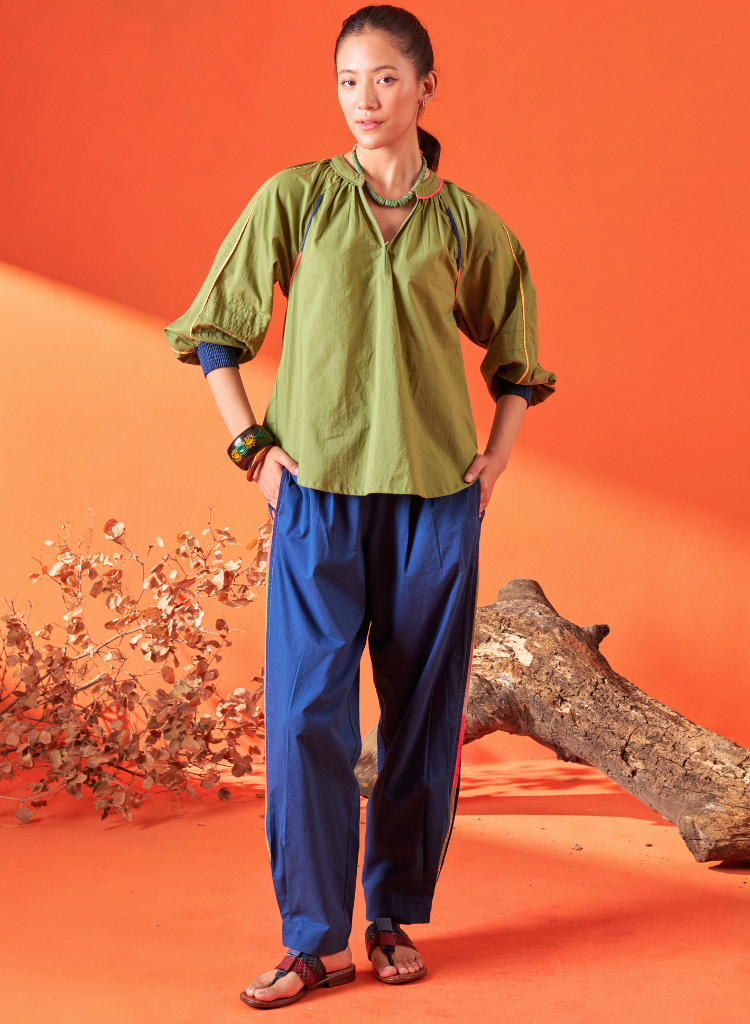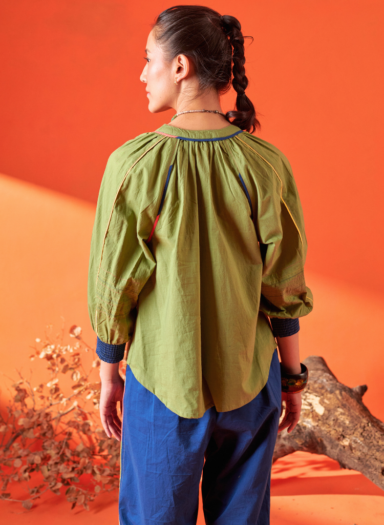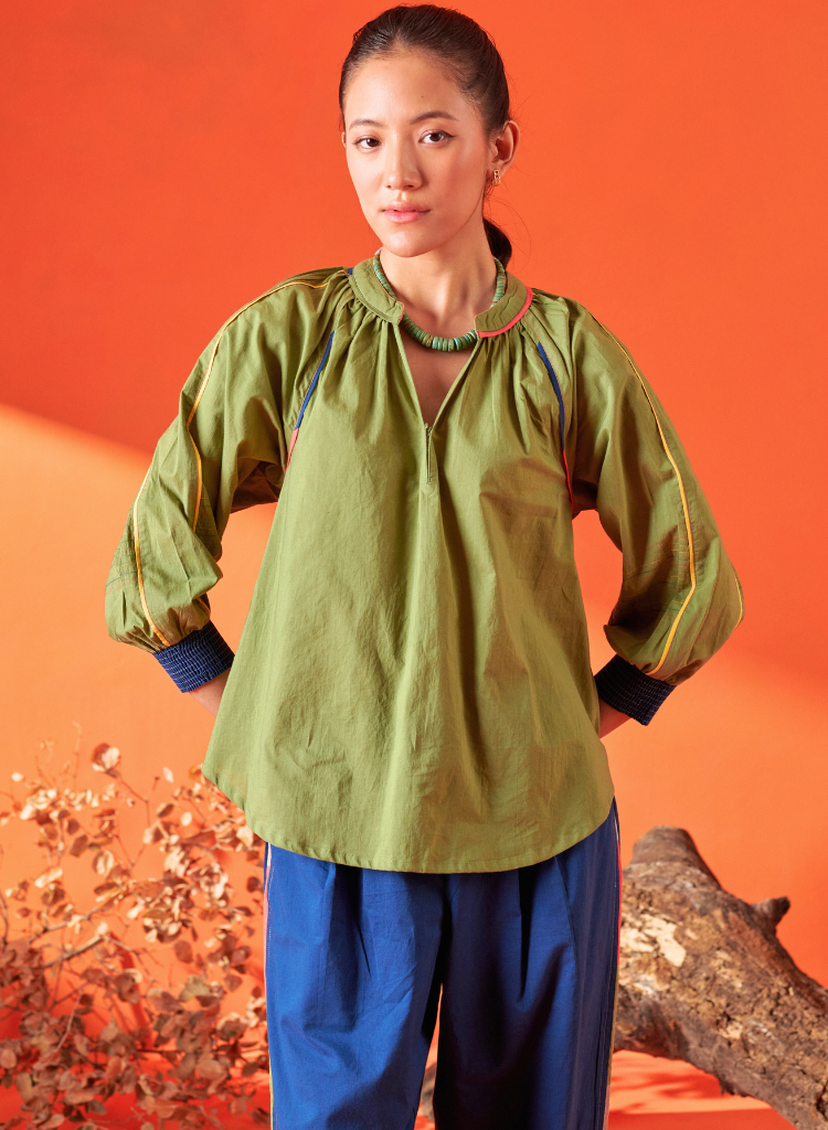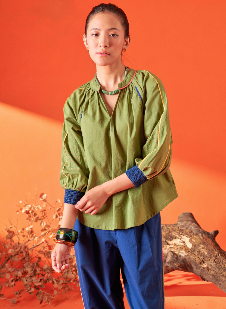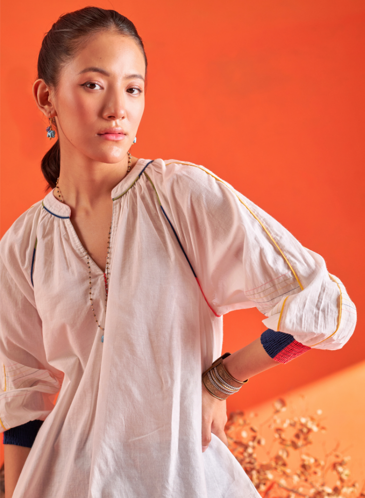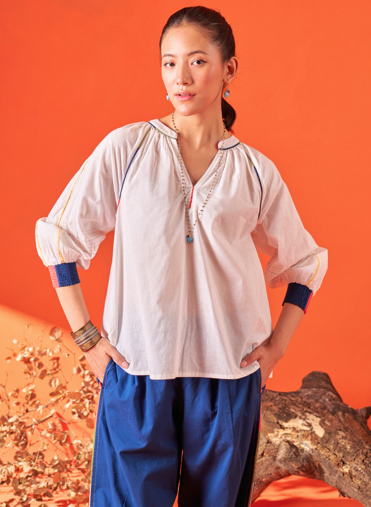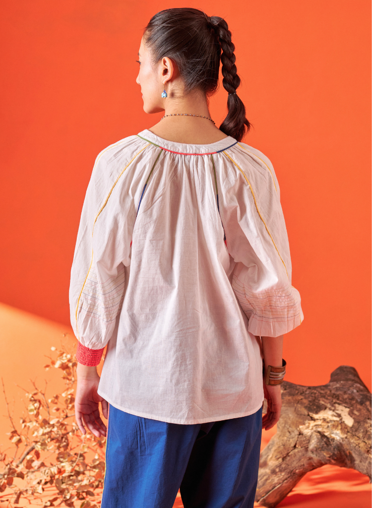 A relaxed fitting top with multicoloured thread stitching throughout and colourful binding on neckline and sleeves. Features smocked cuffs with striped detailing. The model is 5'7" and is wearing a size S.