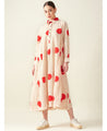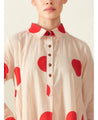 A relaxed-fitting midi dress with clamp-dyed polka dots featuring a slim collar and a half-button placket. Length 46". The model is 5'7.5" and is wearing a size S.