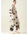 A relaxed kaftan-style tunic with clamp-dyed polka dots. Features a mandarin collar, a front button placket, side slits and inseam pockets. Length 42", Sleeve length 17". The model is 5'7.5" and is wearing a size S.
