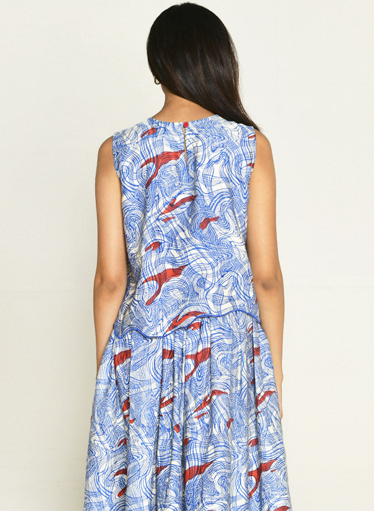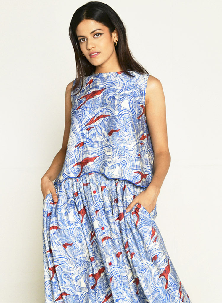 An abstract block-printed, sleeveless top with a relaxed-fitting and a keyhole button-loop closure at the back featuring a round neck. Length 20". The model is 5'7" and wears a size XS.