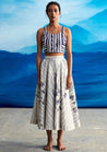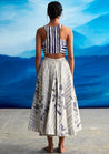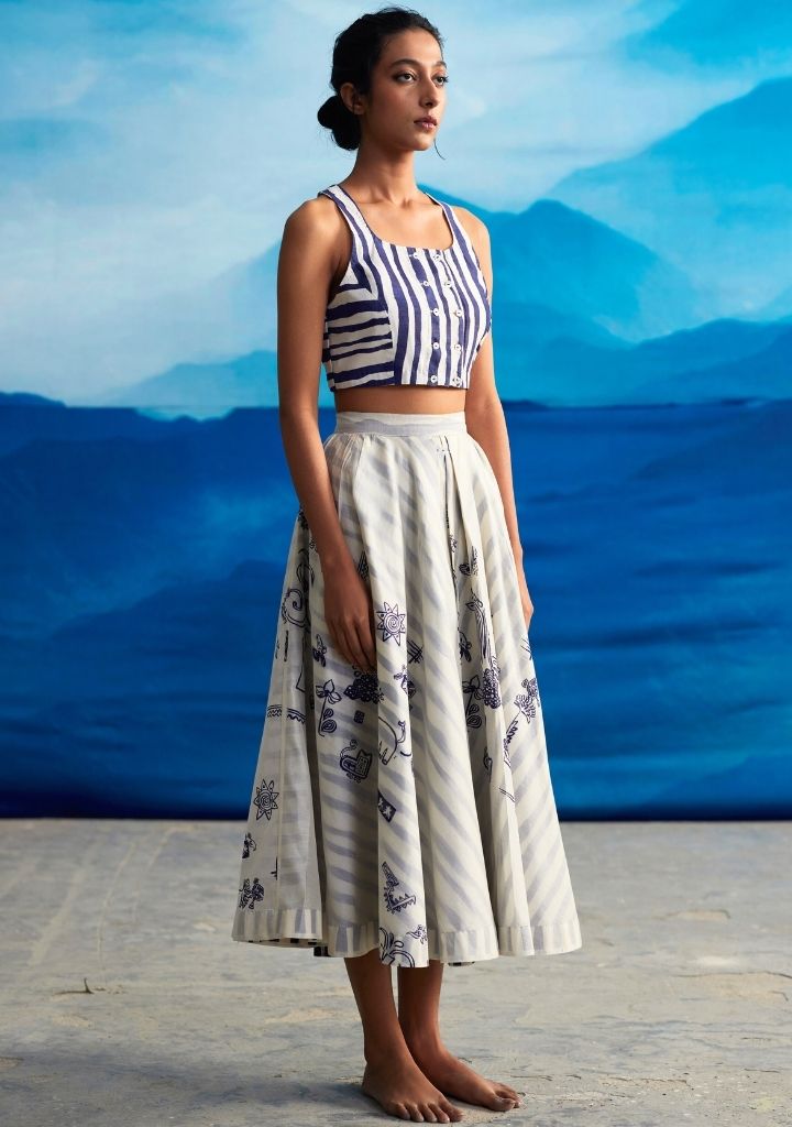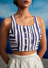 A tailored fit blouse with exquisitely uneven stripes and a double-breasted front button opening. Features a square neckline with rounded edges. Length 14". The model is 5'8" and is wearing a size M.