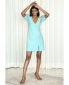 A wrap-style dress with floral printed puffed sleeves. Features a deep V-neck and front button placket. Length 35". The model is 5'10" and is wearing size S.