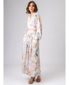 A pair of abstract printed pants with a side-zip closure featuring gathers at the waist and inseam pockets. Length 40". The model is 5'7" and is wearing size S.