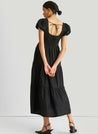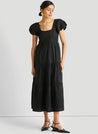 A maxi dress with gathered tiers and short puff sleeves featuring a square-neck, elasticated back and tie-up, inseam pockets and side zipper closure. Length 52"-54". The model is 5'9" and is wearing a size XS.