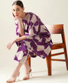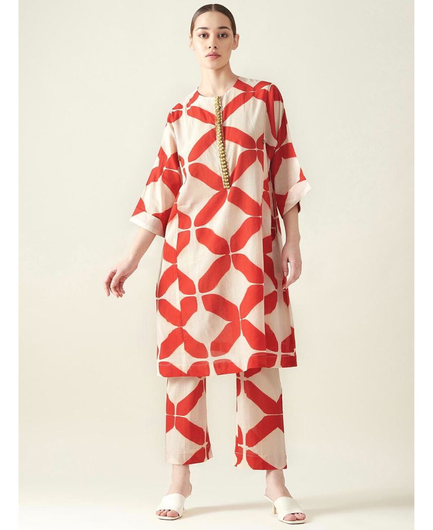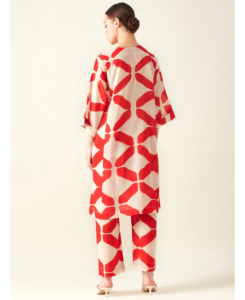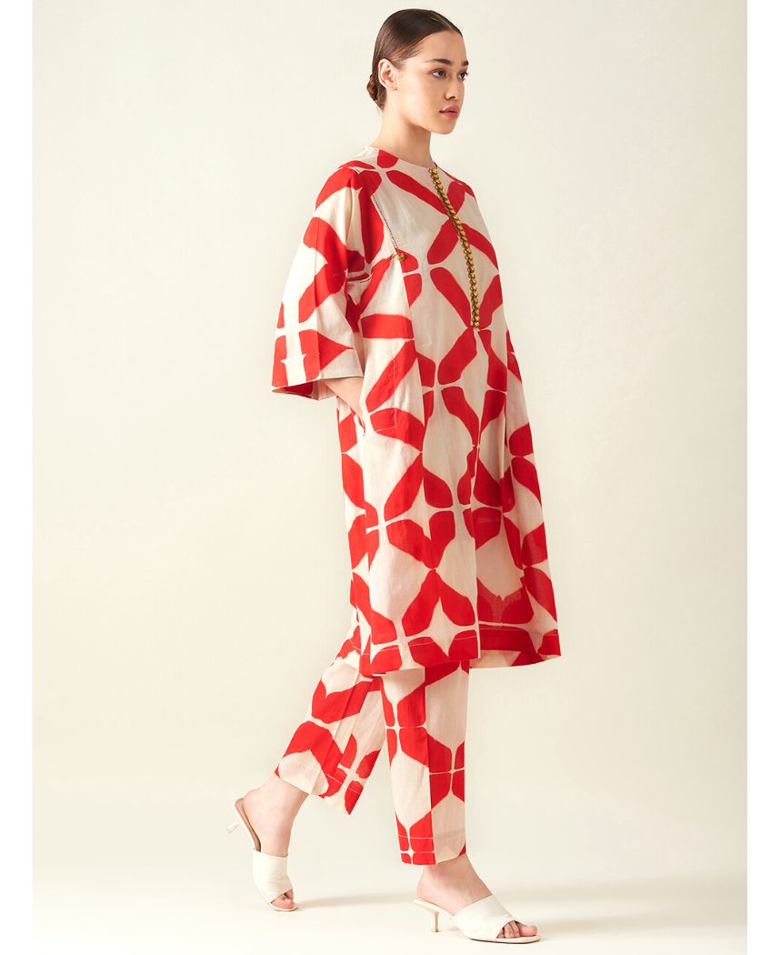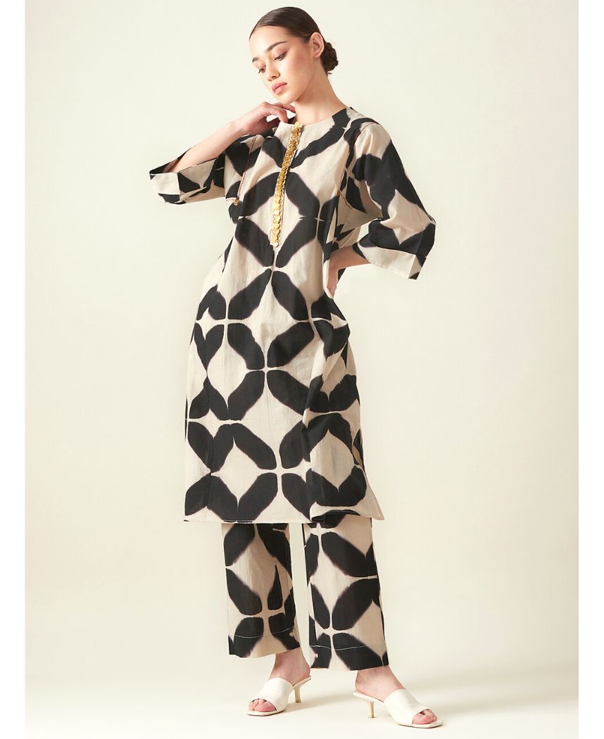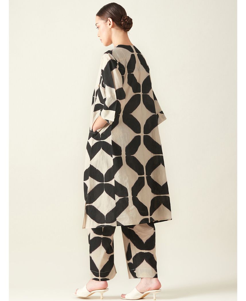 A relaxed kaftan style tunic with a clamp-dyed geometric print and wide sleeves. Features a close neck, a front placket with embellished metal work and inseam pockets. Length 42", Sleeve length 17". The model is 5'7.5" and is wearing a size S.