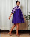 A gathered mini dress with a floral hand-block printed yoke. Features a high collar with a tie-up back, puffed sleeves and inseam pockets. Length 33.5". The model is 5'6", and is wearing size M.