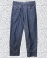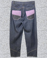 Denim streetwear pants with varied cuts and slant fly featuring hand crocheted back pockets. Length 41". The model is 6'1" and is wearing a size S.