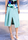 A midi skirt with box pleats with an overlapping front detail and a contrasting printed crepe waist belt featuring side pockets. Length 33". The model is 5'9" and is wearing size S.