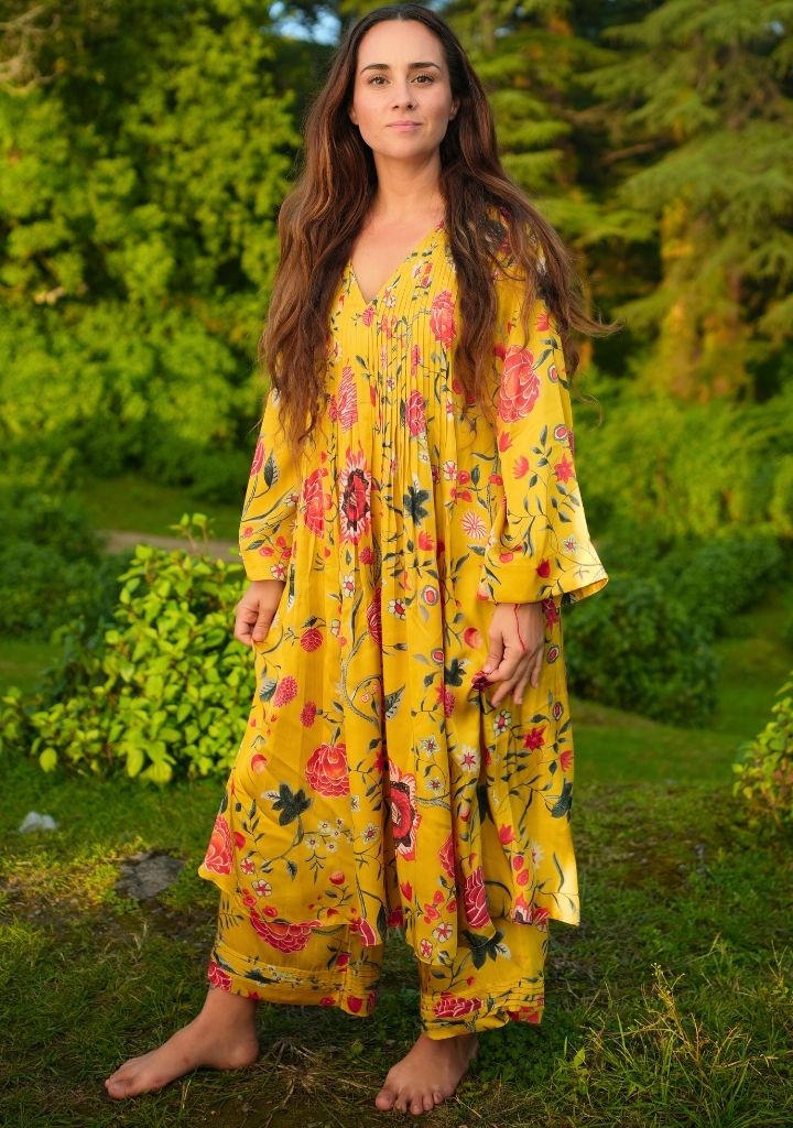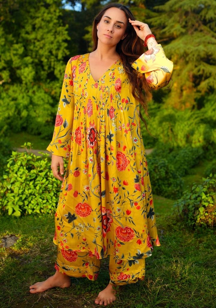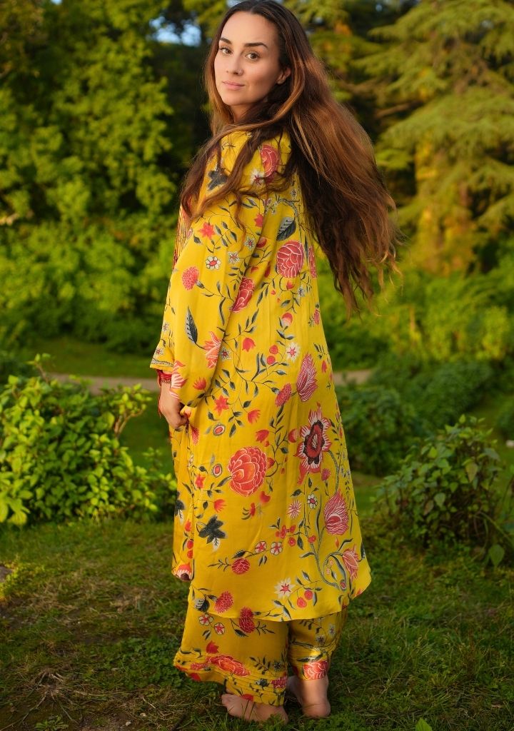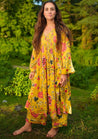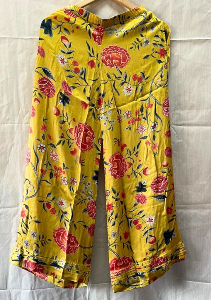 A pair of pants with Kyaari print and pin-tuck hem detail featuring an elasticated waist. Length 36". The model is 5'2" and is wearing a size M.