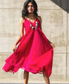 A fit and flare midi dress with an asymmetric hem featuring a V-neck and noodle straps. Length 40". The model is 5'5" and is wearing size S.