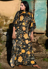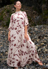 A midi kaftan dress with Daali print and high neck featuring relaxed-fitting 3/4 sleeves and keyhole closure at the back. Length 49".