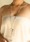 A statement long necklace with no fastening featuring hand-carved rainbow moonstone, amethyst, labradorite, pearl, and seed pearls vitreous enamel eye handcrafted in silver.