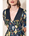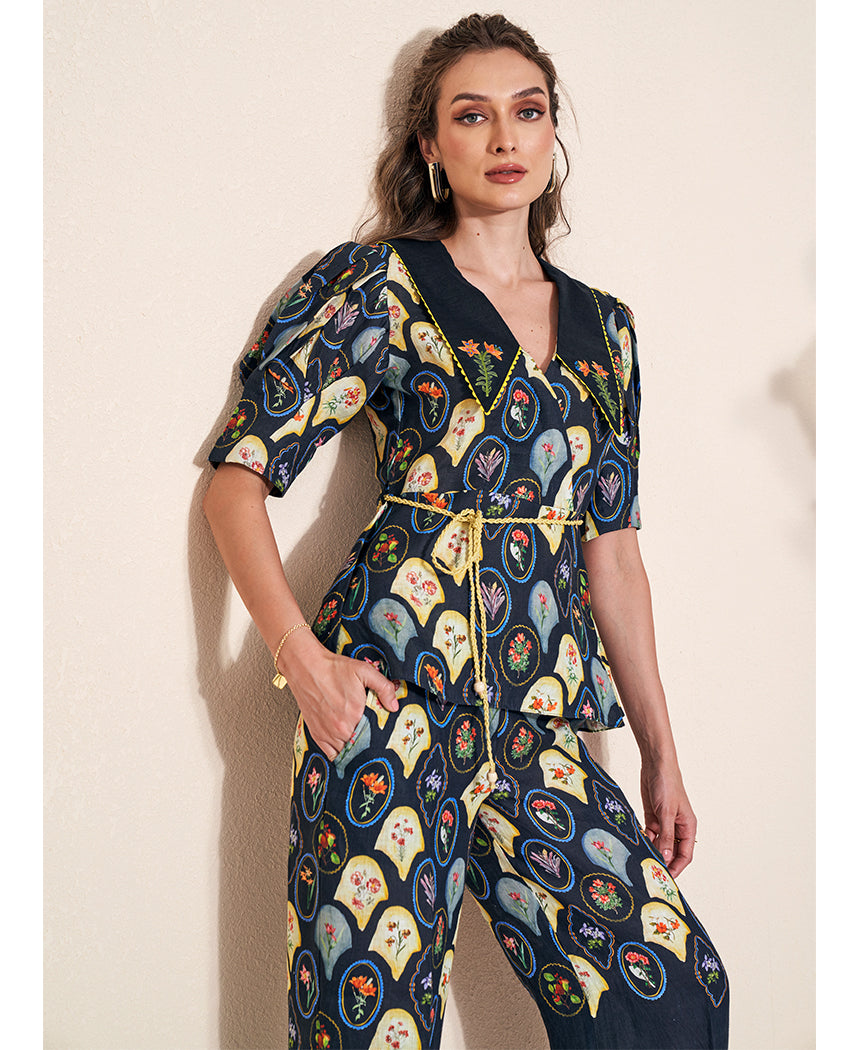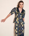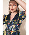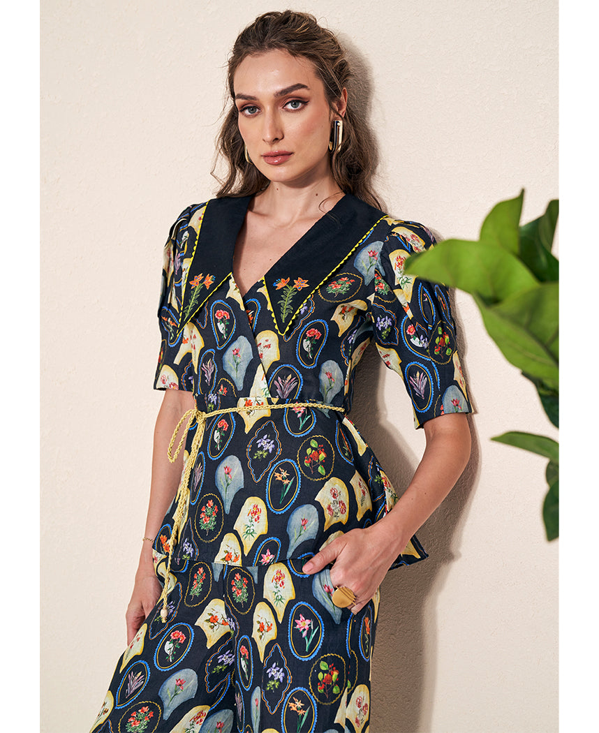 A floral printed wrap style peplum top with wide flat collar and voluminous sleeve featuring side closure and hand embroidered motifs. Length 25". The model is 5'8" and is wearing size XS.