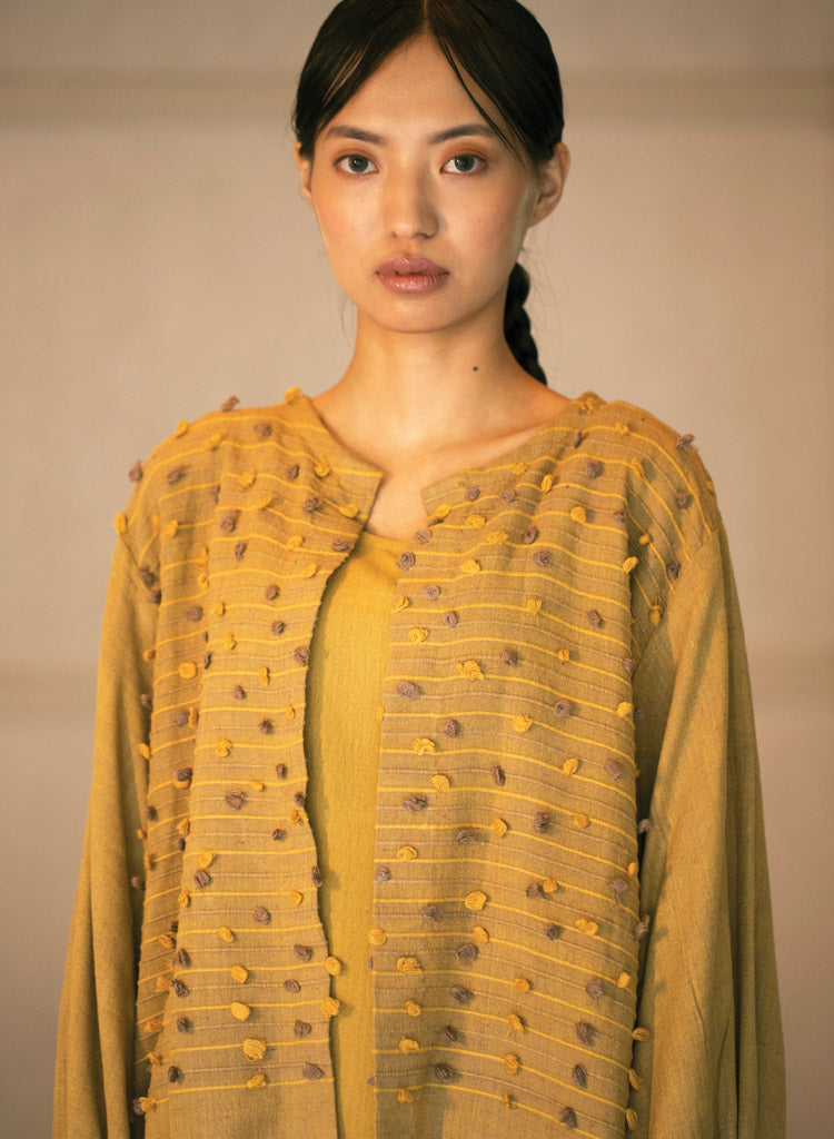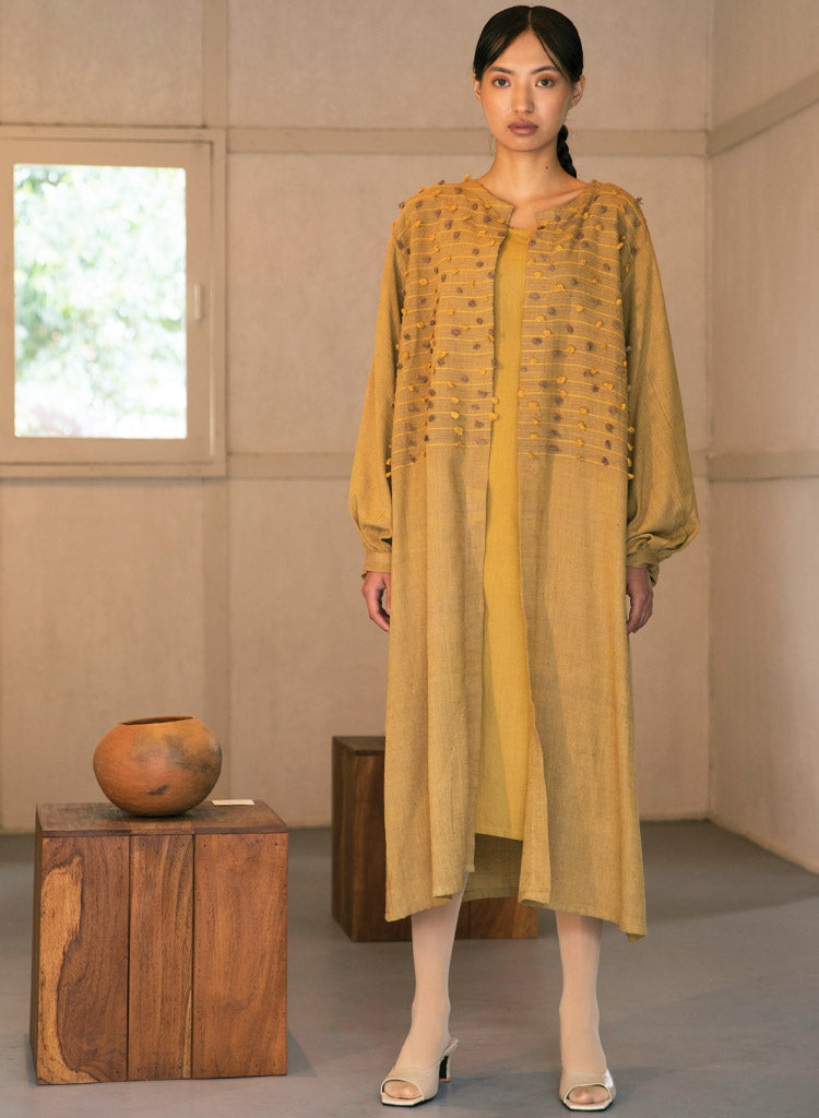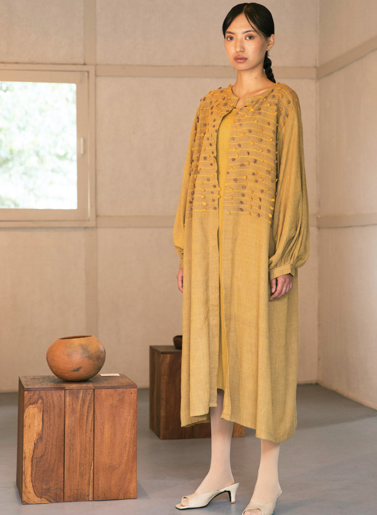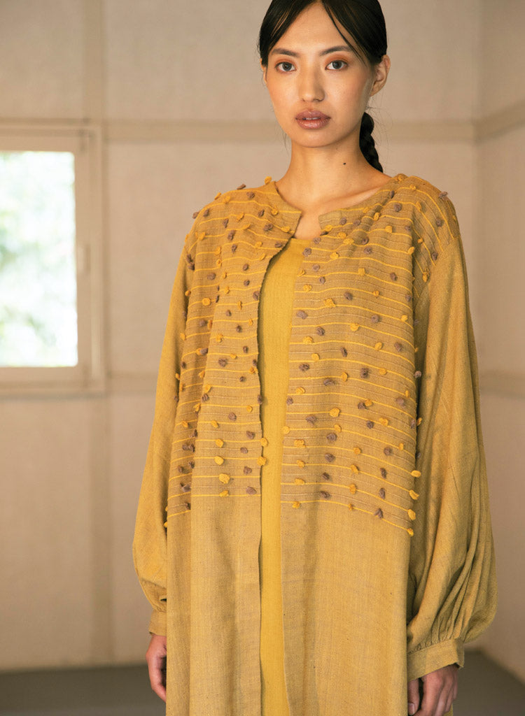 A long open jacket with hand woven weft techniques featuring a round neck, drop shoulders and cuffed sleeves.