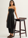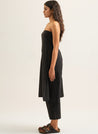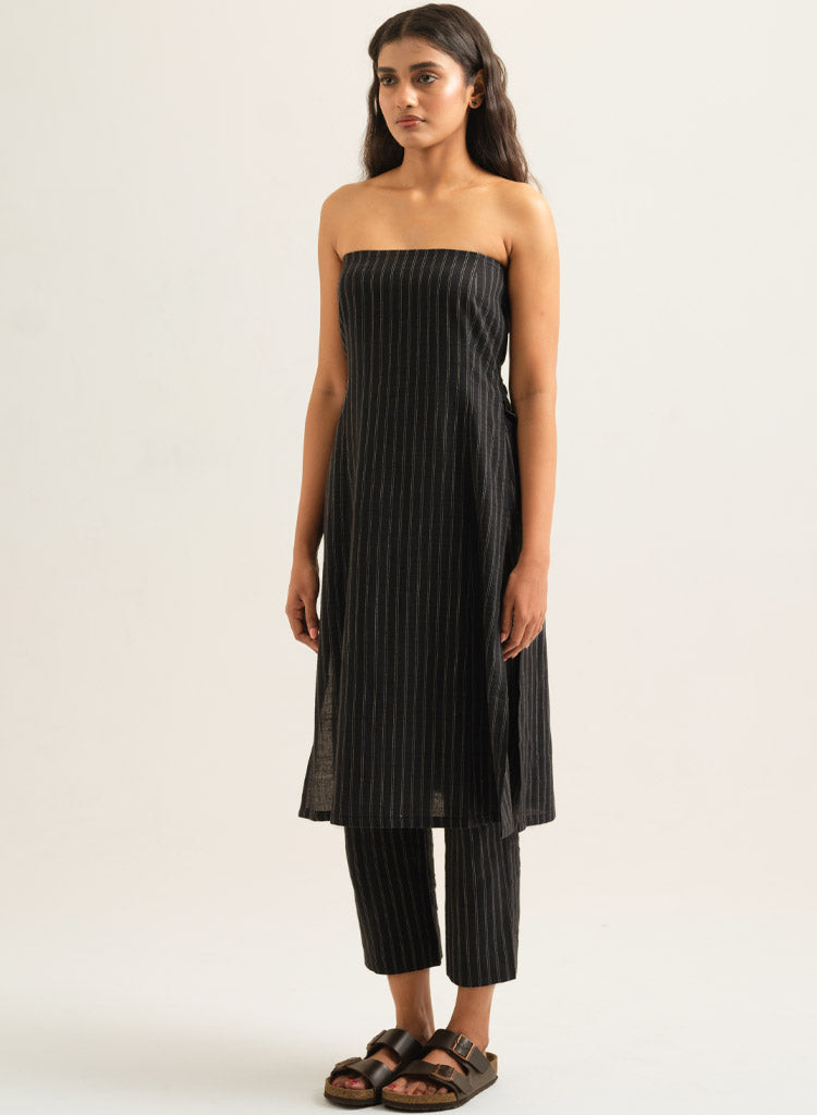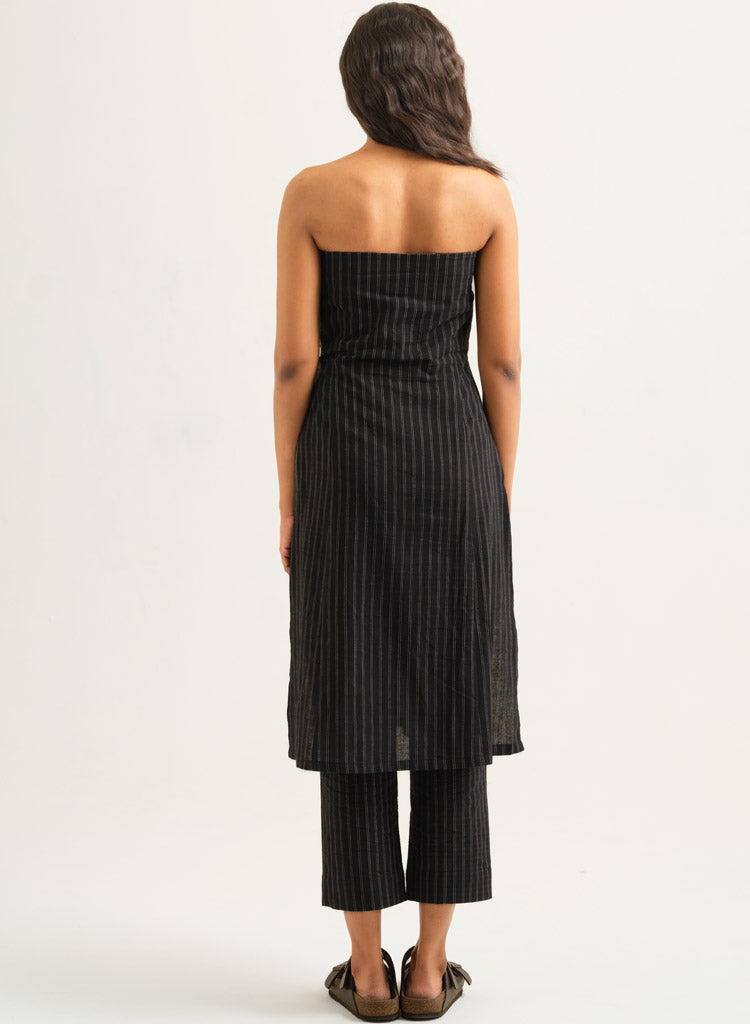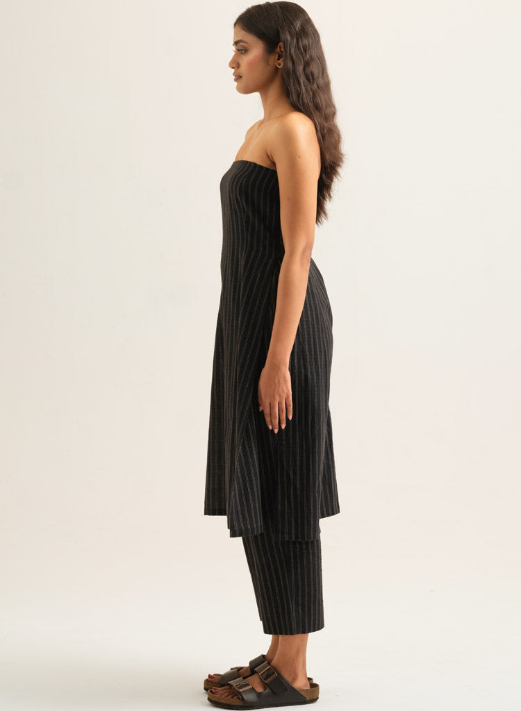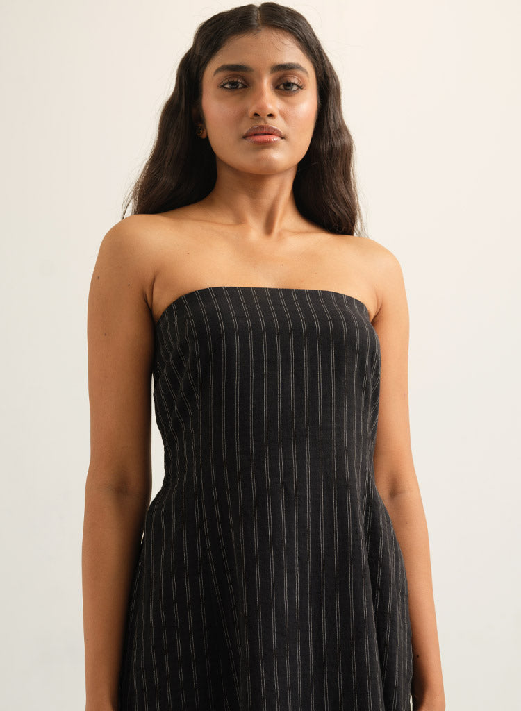 A striped strapless tunic featuring high side slits and a side zipper. Length 42". The model is 5'5" and is wearing size S.