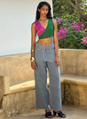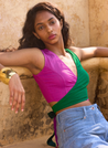 A fitted sleeveless crop top with a wrap silhouette in half-and-half colour featuring a V-neckline and tie-up fastening. The model is 5'9" and is wearing size S.